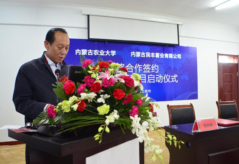 儀 式上,內(nèi)蒙古民豐薯業(yè)有限公司總經(jīng)理張國向來賓介紹了民豐薯業(yè)的基本情況,宣讀了“內(nèi)蒙古民豐薯業(yè)有限公司關(guān)于聘請(qǐng)科研課題首席專家的決定”。內(nèi)蒙古農(nóng)業(yè) 大學(xué)王春光、樊明壽,國家馬鈴薯產(chǎn)業(yè)技術(shù)體系專家蒙美蓮等九名教授被聘請(qǐng)為技術(shù)課題研究首席專家;內(nèi)蒙古農(nóng)業(yè)大學(xué)芒來副校長介紹了學(xué)校的科研情況,對(duì)校企 戰(zhàn)略合作高度重視、充滿信心。